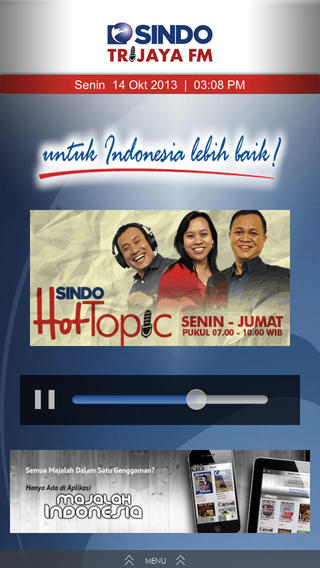 Sindo Trijaya Application is an online radio streaming for Sindo Trijaya FM Radio. This application can be accessed via iPad and iPhone and it can be your information and entertainment radio. The segment of the listeners are coming from professional, entrepreneur, or business persons up to 40 years old.